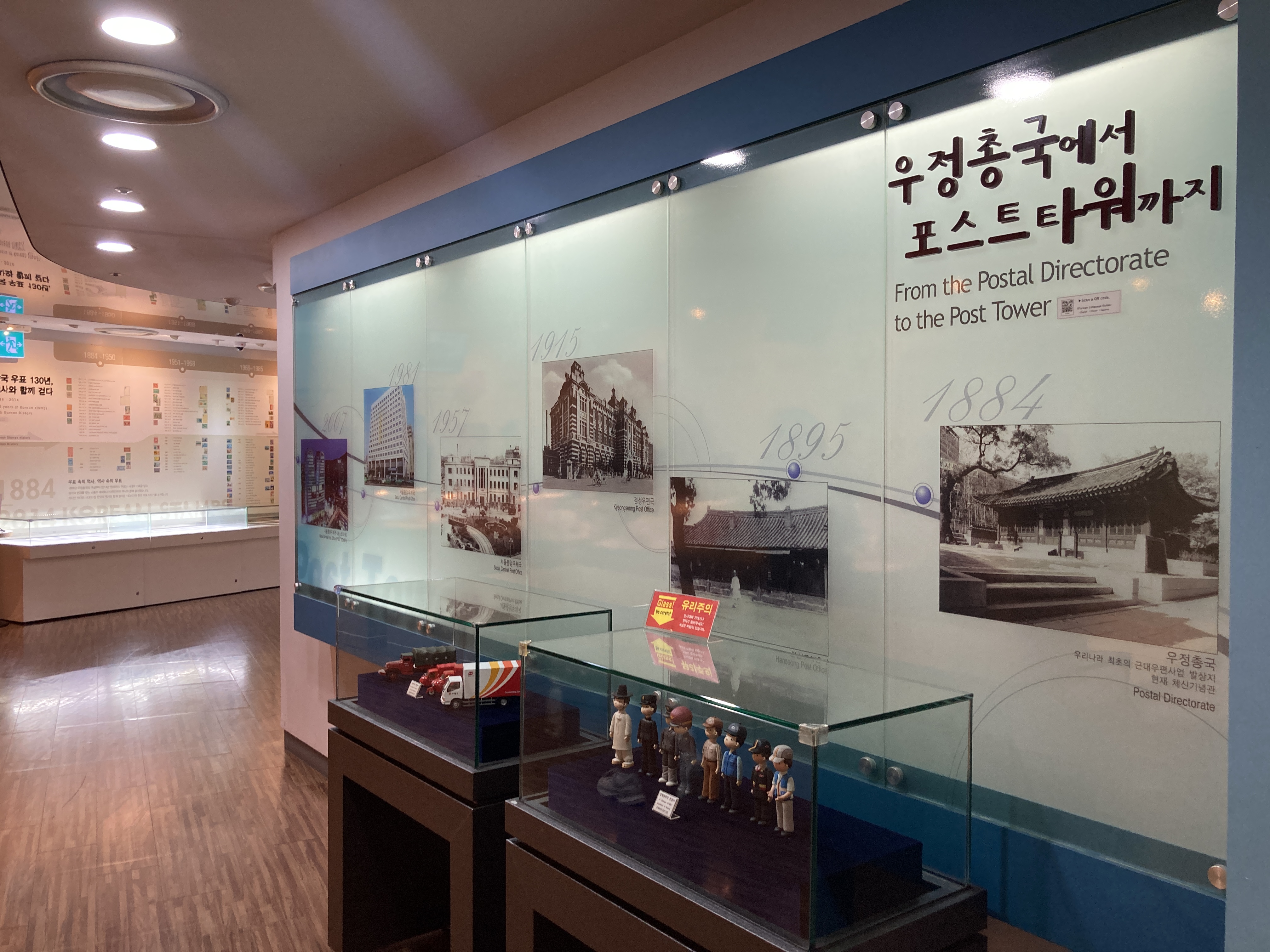 들어가면 조계사 앞 우정총국에서 현재 중앙우체국까지의 건물 사진과 집배원의 복장, 우편 차량을 볼 수 있습니다.