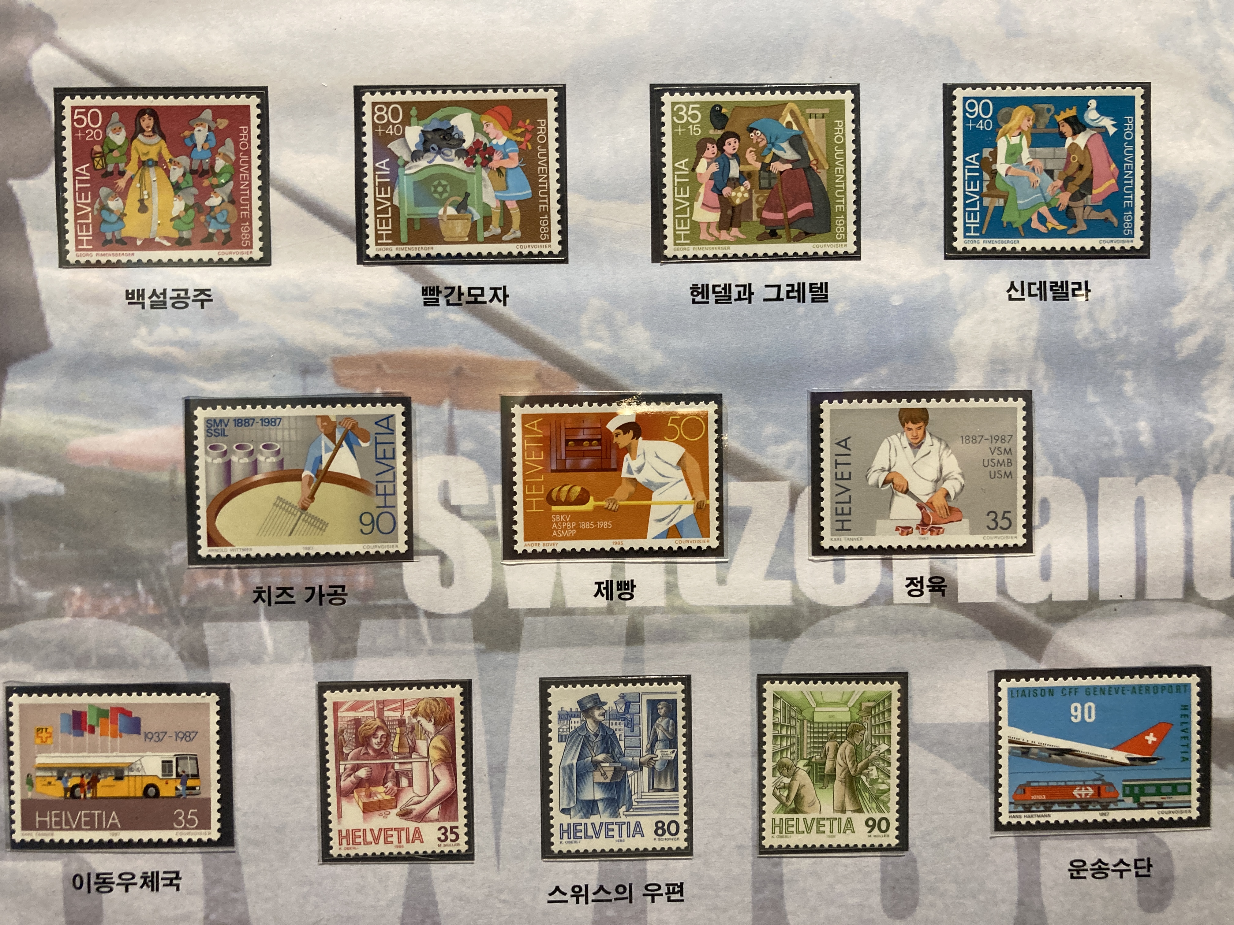 세계 각 나라의 우표도 볼 수 있습니다. 이건 스위스인데, 맨 위 동화 우표 마음에 드네요.