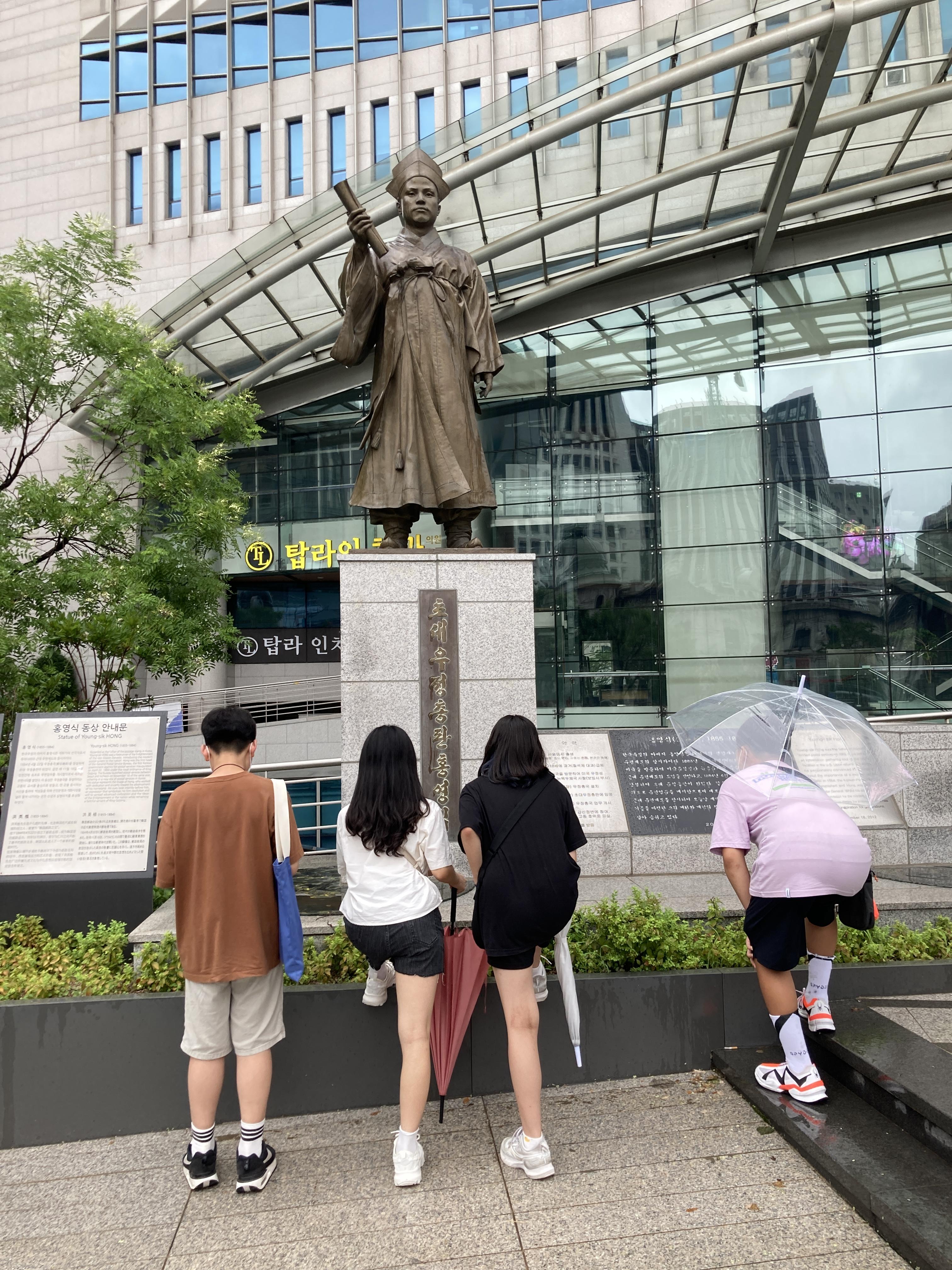 중앙우체국 앞에 우표 박물관으로 내려가는 곳에는 동상이 있습니다. 우정총국 총판으로 근대 우정사무를 도입 추진한 홍영식의 동상입니다. 홍영식은 아버지가 영의정 홍순목으로 금수저의 집안에서 태어난데다 어렸을 때부터 총명하고 사려깊기로 유명했습니다. 그는 1873년 식년문과에 합격하여 일찍부터 두각을 나타냈고, 1880년 김홍집 수신사의 수행으로 일본에 다녀왔으며 1881년 신사유람단의 일원으로 김옥균, 박정양, 어윤중 등과 함께 다시 일본에 갔습니다. 그리고 1883년에는 보빙사로 민영익, 유길준 등과 함께 미국에 다녀왔습니다. 서구문물을 확인한 그는 일본 육군 제도를 보고하고, 미국식 농기계 도입을 건의하였습니다. 특히 우정, 전신 업무에 관심이 많아 직접 우편 업무의 개설을 고종에게 건의하여 1884년 우정총국의 설치를 이끌어냈습니다. 총판이 되어 우정국 분국 설치, 우표의 발행 등을 추진하였습니다. 그는 수구당을 몰아내고 개혁정책에 박차를 기하기 위해 갑신정변을 주도했습니다. 그리고 정변의 기점을 우정국 낙성식인 1884년 12월 4일로 잡았습니다. 그러나 결국 청국의 개입으로 12월 8일 삼일천하로 끝나면서 그는 청군에게 살해당합니다. (처형되었다는 설도 있습니다.) 그리고 그가 주도했던 우정업무도 이듬해 1월 5일 중단됩니다. (일단 문제가 생기면 없애고 보는 오랜 전통이라고나 할까요?) 그 탓에 이때 발행된 우리나라 첫 우표(문위우표)는 우표 실물은 존재하나 아직 사용된 상태로 발견된 것은 없다고 합니다. 따라서 혹시 문위우표 실체(봉투에 붙여 소인인이 찍힌 것)를 찾으면 희소성을 넘어 우리 우편 역사의 중요한 문화재가 될 것입니다. (- 박물관에서 알게된 지식) 어쨌든 박물관 설명보다 더 긴 동상설명이었습니다.