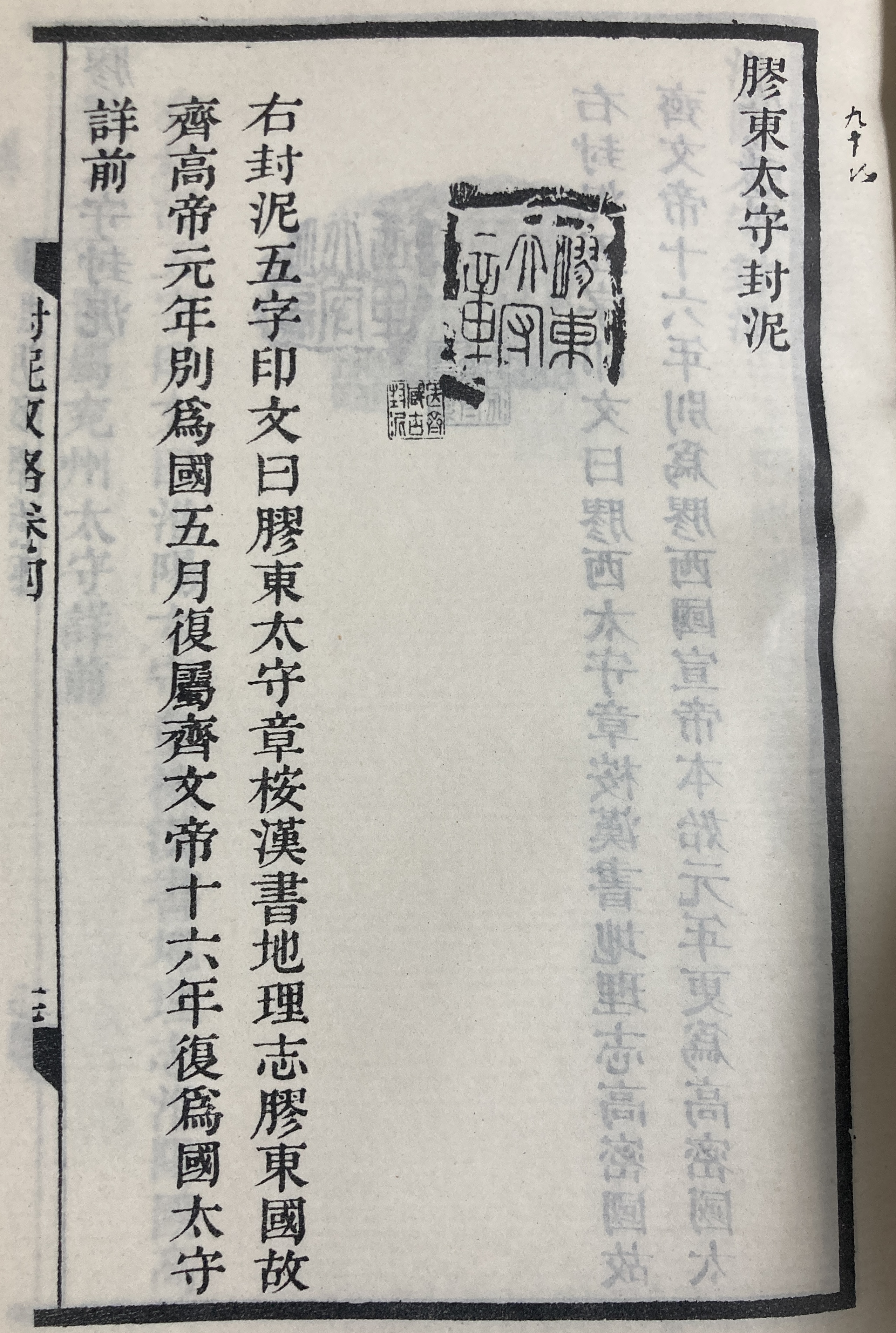 오른쪽 봉니 5자 인문은 “膠東太守章(교동태수장)”이다. 한서 지리지에 따르면 교동국膠東國은 옛 제齊나라로 고제高帝원년(202) 따로 국國을 두었다가 5개월 뒤 다시 제나라에 속하게 했다. 문제文帝16년(165.10.~164.9.) 다시 국으로 삼았다. 태수太守는 앞서 설명했다.