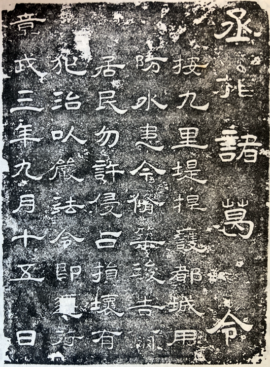 (승상 제갈의 령. 구리제방은 도성을 보호하고 수해를 방지하는데 사용하는 것이다. 너희 백성에게 고하니 침범하여 점유하거나 파손하는 행위를 것을 절대 허락치 아니한다. 만일 범하는 자가 있다면 엄법으로 다스릴 것이다. 명령을 바로 따르라. 장무3년(223) 9월 15일.