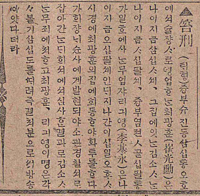 태형 중부 수진동 30통 5호에서 술장사로 영업하는 최광훈은 나이 지금 34세, 그 집에 있는 김소사는 나이 지금 48세, 중부 염천골 18통 가 1호에 사는 무업자 이기영은 나이 지금 58세인데 지나간 20일 오후 4시경에 최광훈의 집에 회동하여 화투를 하다가 그곳에서 순사에게 발견되어 소관 경찰서로 잡아갔는데 그곳에서 심사한 결과로 김소사는 무죄에 처했고 최광훈, 이기영 두 사람은 각각 볼기 30도를 때려 즉결처분하고 풀어줬다더라. (매일신보 1912.3.28.)