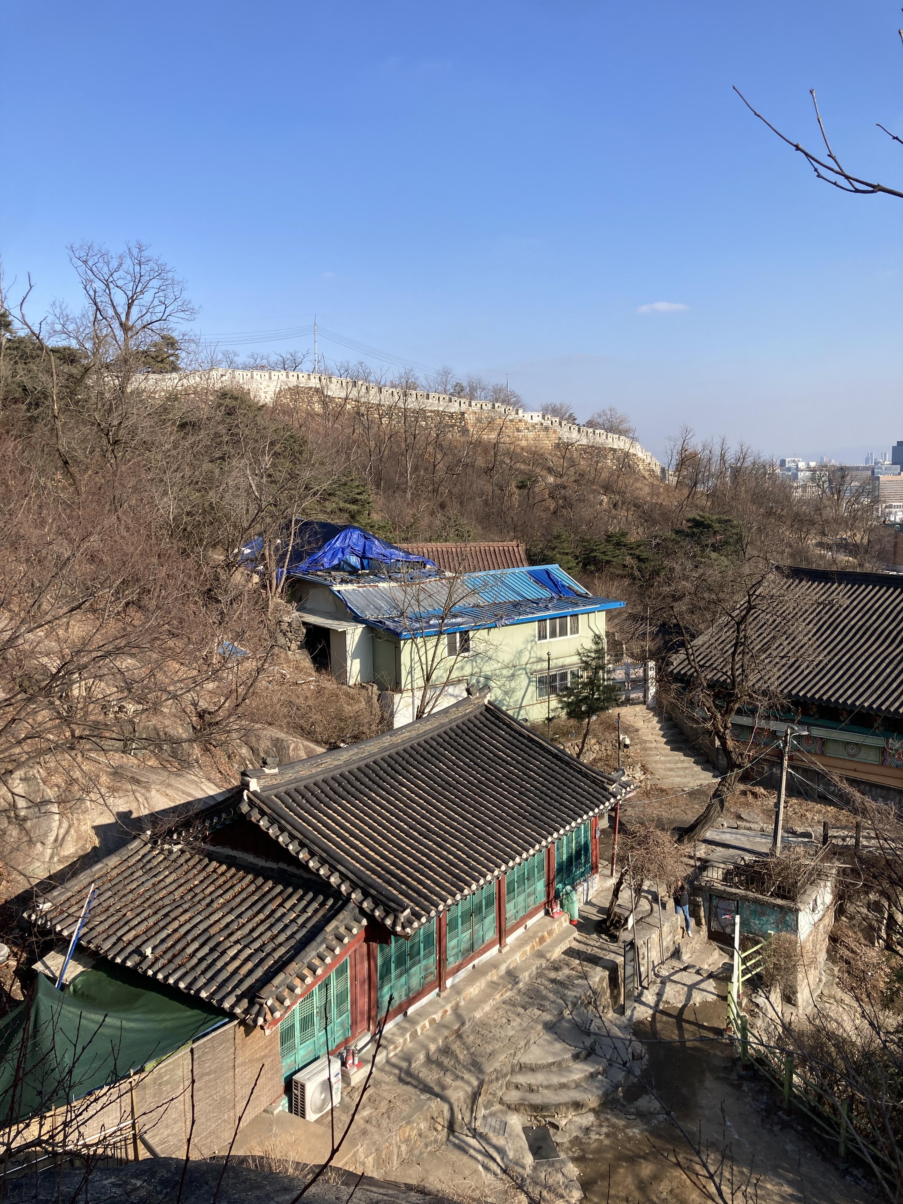 남한산이나 북한산이나 성곽이 있는 곳에는 응당 사찰이 있기 마련이다. 사찰은 성곽 수비대에 물자를 공급하기도 하고, 여차하면 승병을 동원할 수도 있다. 오늘날 인왕산 서사면에는 이 절 외에도 작은 사찰과 암자로 가득하다.(대부분 집들이 그렇다고 보면 된다.) 그러나 궁궐이 내려다 보여 폐사되었다는 이야기나 김상헌의 기록을 보면 인왕사는 인왕산의 동사면에 있던 절로 보인다. 즉 그때의 인왕사와 작금의 인왕사는 완전히 다른 절이라는 말이다. 이곳의 사찰들은 업력이 그다지 오래되지 않은, 국사당이 옮겨 온 뒤 생겨난 절들로 그런 까닭에 다른 절들과 달리 무속적 성격이 강하다. (이름은 절이지만 내용은 당집) 인왕사는 절 건물이 이곳저곳 흩어져 있고 옆집 앞집 중간은 다른 절이나 암자다. 마치 몇 개 건물로 이곳저곳에 흩어져 있는 미국의 일부 대학 캠퍼스 같다. 일주문을 지나 조폭 팔뚝 문신 같은 벽화 사이로 올라가면 인왕사 대웅전이 나오고, 거기서 몇 걸음 더 가면 국사당이다.