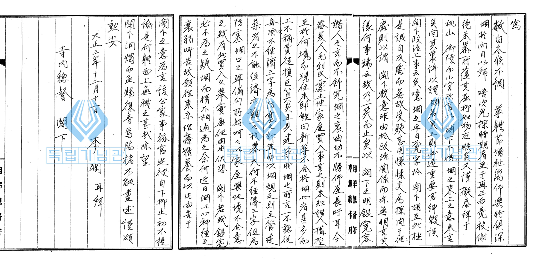 독립기념관은 독립운동사 데이터베이스인 한국독립운동정보시스템을 운영한다. 이곳에서 독립운동가가 남긴 자료와 독립운동 관련 기록들을 살펴볼 수 있다. 올해 광복절은 광복 80주년이기에 더 뜻깊다. 오늘은 여기서 서비스하는 자료 중 조선 초대 총독 데라우치가 모은 기록인 데라우치 문서 속 이강공(전 의친왕)의 편지를 소개한다. 의친왕은 3.1. 운동 직후 망명사건으로 '독립운동가'로 분식되어 있는데, 그의 행적을 살펴보면 독립운동과는 영 딴판이다. 이 편지 역시 그 증거 가운데 하나다. 편지의 작성일자는 1914년 12월 12일, 수신자는 데라우치 마사타케다. 어떤 이들은 이강이 일본행을 극렬 반대했다고 하는데, 이 편지에서 그는 메이치 천황의 무덤도 참배하고 싶고, 또 일본에서 체재하고 싶은데 주변에서 그 뜻을 전달하지 않는다며 항의했던 것을 보면 늘 그러지는 않았던 것 같다. 또한 사동궁에 대한 이야기도 나오는데, 그가 사동궁 양관을 몹시 싫어했음을 알 수 있다. (이강은 실제 사동궁에 잘 들어오지 않았다는 이야기도 있는데, 그것이 사실이라면 이유를 파악할 수 있는 대목이다.) 편지의 본문은 아래와 같다.