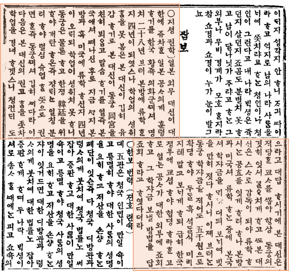 [지성 권학] 일본 외무대신이 대한에 주차한 일본공사에게 훈령을 내렸다. 한국 황족 의화군께서 명치28년(1895)부터 일본(본방)에 유학 한지 4년이 되었으나 학업을 성취하지 못한 것은 본 대신이 깊이 유감하는 바이다. 본 대신이 동궁同宮을 친히 뵈옵고 말씀 하기를, 일찍 본국에서 떠나신 후로 지금 까지 본방과 혹 미국에 유학하신지 4년이나 되었건만 학업을 성취하지 못하니 동궁은 물론 하고 대한제국 조정(한정韓廷)을 위해 개탄스러운 바, 앞으로는 한층 분발하여 열심히 수업할 뜻으로 권면하자, 동궁께서는 깊이 깨달아 았으니, 앞으로는 본 대신의 권고한 대로 학업에 힘쓰겠으니 도움을 부탁한다고 했다. 본 대신은 적당한 교사를 뽑아 항상 동궁의 곁에 있어 가르치게 하고 또 본 대신이 스스로 감독이 되어 유학하시는 효과를 있게 하려 한다. 그러나 일본(본방)과 미국서 유학 하는 중에 본국서 학자금을 매양 늦게 보내줘 빚을 많이 졌다 하니 이제 부터는 동궁 학자금을 적어도 5,000원으로 확정 하여 두 달 혹 석 달씩 미리 지체 말고 보내게 하되 급히 한국 정부에 교섭 하여 협정 하라 한 고로 일본공사가 대한제국 외부에 조회하고 그 학자금 보낼 방법을 답장 조회해달라고 하였다더라.[독립신문(獨立新聞) 1899.3.7.]