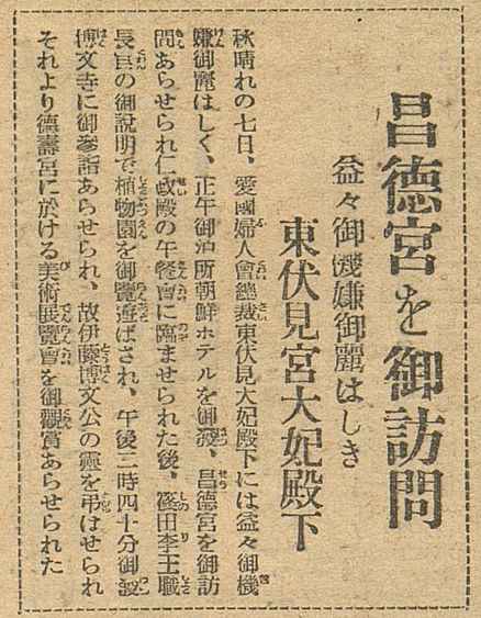 맑은 가을 7일 애국부인회 총재 히가시 후시노미야 대비 전하는 나날히 평안하고 고우시니 정오 숙소 조선호텔을 출발하여 창덕궁을 방문하셔서 인정전 오찬회에 참석하고 그 후 시노다 이왕직 장관의 설명으로 식물원을 유람하고 오후 3시 40분 박문사로 가서 고 이토 히로부미 공의 영령에 조문하고 덕수궁에서 미술전람회를 관람하셨다.