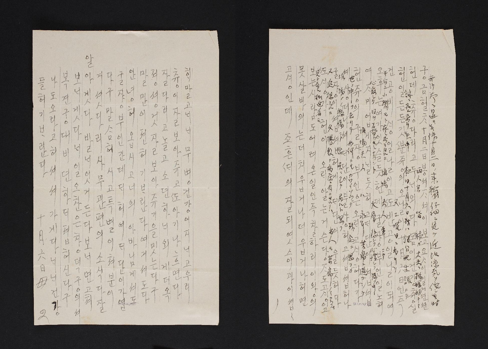 궁금할 차 10월 2일 봉서(편지) 자세히 보고 요사이 일기 선선한데 충(沖) 데리고 두 내외 다 몸이 건강히 충실한 일 든든 기쁜 중에 오늘이 10월 6일인 즉 건공 비(마쓰다이라 요시히코(松平佳子, 1911.10.6.~2006.6.28.) 생일날이고 반공일날(반공휴일, 즉 토요일)이 되어 오후는 여가 있을 듯한데, 호리바(堀場) 부인 일로 재미없게 지낼 듯하고 대단히 섭섭한 중의 호리바 부인은 오래 고생하다가 세상 떠나서 대단히 불쌍하고 섭섭하나 호리바가 섭섭하여 대단히 울듯하다. 생각하니 오래 앓는 것은 당자도 고생이고 보는 사람도 어려운 일인 즉 차라리 이왕의 못 살 바에는 더 춥거나 덥거나 하면 고생인데 좋은 때 잘 되었으니 과히 섭섭해 말고. 내내 무병 건강히 지내고 우리 충이 잘 보아주고 아기 낳으면 다 잘 데리고 놀고 소전하 내외께 더욱 정성껏 잘 보아주기를 믿는다고 말 많이 전하기 바란다. 여기서도 다 안녕하옵시고 너의 아버님께서도 호리바 부인 간 데 대하여 대단히 가엾다고 말씀하시고 특별히 처분이 계셨다. 이 사무관 편에 소식 다 잘 았겠다. 발내 있거든 다 보내면 고쳐 보내겠다. 내일 오찬은 창덕궁에서 후시미노미야(伏見宮) 대비 전하 대접하신다고 나도 오라고 하셔서 가겠다. 내내 건강들 하기 바란다. 10월 6일 母