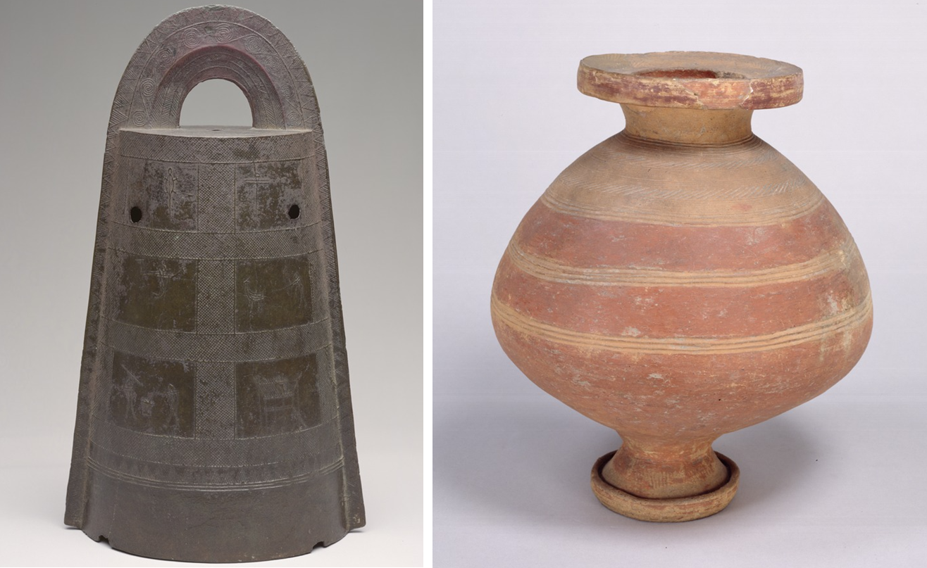 조몬토기는 상당히 독특합니다. 생김새로만 봐서는 다음 시대의 야요이 토기보다도 멋지죠. 앗, 혹시 야요이 유물을 보여주며 시대순으로 배열하라는 문제가 나올 수도 있겠군요. 야요이 시대를 대표하는 것이 22년도 1번 문제의 ①입니다. 가사 모양 동탁(청동 방울)이라고 부르지요.(왼쪽) 그리고 야요이 토기는 이렇게 생겼답니다.(오른쪽)
