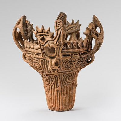 이것은 화염형(일본어로 가엔가타) 또는 불꽃모양 토기라고 합니다. 일본 조몬시대 중기를 대표하는 토기이며, 일본을 대표하는 문화재 가운데 하나입니다. 그래서 2020년 도쿄 올림픽 성화대 디자인에도 사용했답니다. 조몬은 한자 '繩文'으로 새끼줄 문양이란 뜻입니다. 토기 표면에 새끼줄을 꼬아놓은 듯한 무늬가 있다고 해서 이것을 조몬토기라고 하고 이 토기가 사용되었던 시대를 조몬시대라고 합니다. 조몬시대는 신석기 시대로 대략 기원전 15세기부터 3세기(학자마다 다릅니다만)까지입니다. 언젠가 다시 등장에 답이 되려면, 우리 신석기 시대(기원전 8천년~1500년)의 대표작 빗살무늬 토기와 함께 나와 비교 대상이 되던지(– 이 경우 시대가 다르니 주의!!!) 아니면 조몬시대를 대표하는 또 하나의 명작, 샤코우기 토우와 함께 나와야 할 겁니다. 샤코우기는 遮光器, 빛을 막아주는 선글라스로 고글같은 것을 썼다고 해서 그리 이름 붙였답니다. 바로 아래 사진과 같은 녀석이죠.