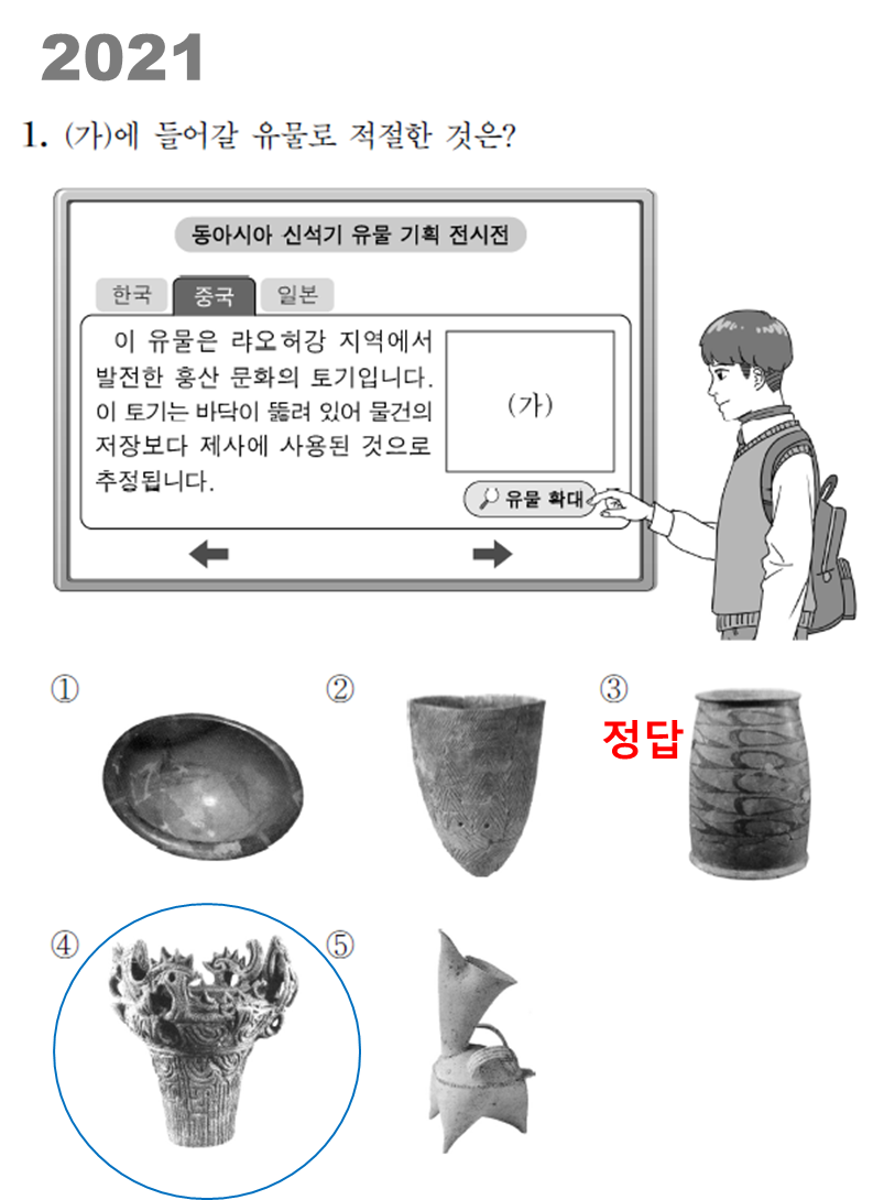 2021년에도 정답은 홍산문화 통모양 토기(중국국가박물관 소장) ③이었지만 ④에 보이죠.