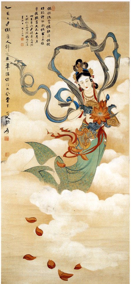 지춘홍의 형상은 장다첸의 회화에서 종종 볼 수 있다. 그녀는 청상원(清商怨), 홍불녀(紅拂女), 미인쌍접도(美人雙蝶圖) 등에서 어떤 때는 고대의 사녀(仕女)로 또 어떤 때는 선불인물(仙佛人物)로, 그리고 이따금은 모던 걸로 등장한다. 그러나 벽화를 그리는 방식으로 선염 묘사한 것은 아마도 이 천녀산화 뿐일 것이다. 천녀산화의 천녀의 모습은 차분하고 얌전한 모습이나 필치나 먹선은 종이 밖으로 뛰쳐나올 듯하다. 참혹한 전란 시기에 사랑하는 여인의 처참한 운명은 사람들을 탄식케 한다.
