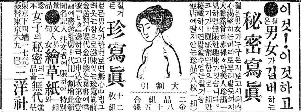 일제강점기에도 성인물의 수요가 있었으니 신문에 광고도 나온다. 허나 이때도 부끄러운 일이었는지 통신 판매하고 구매자의 신상을 보호하는 장치를 두었다. 또 나름 광고에 대한 피드백도 얻고자 본지를 알게된 계기를 답해주면 서비스도 주었다. 인간의 욕망은 변함이 없으나 단지 기술이 부족했을 뿐이라는 생각이 든다.