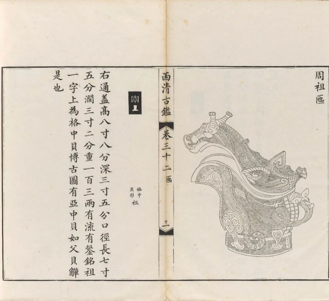 “오른쪽은 뚜껑까지 포함하여 높이 8촌 8분, 깊이 3촌 5분, 구경 긴 곳 7촌 5분, 너비 3촌 2분, 중량 130량이다. 주구 부분에 명문 ‘祖(조)’ 한 글자가 있다. (명문의) 위에는 사각형 구획 안에 패가 있는데, 박고도에는 아자형 구획 안에 패가 있는 것이 보인다. 父貝觶(보패치)이 같은 것이다."